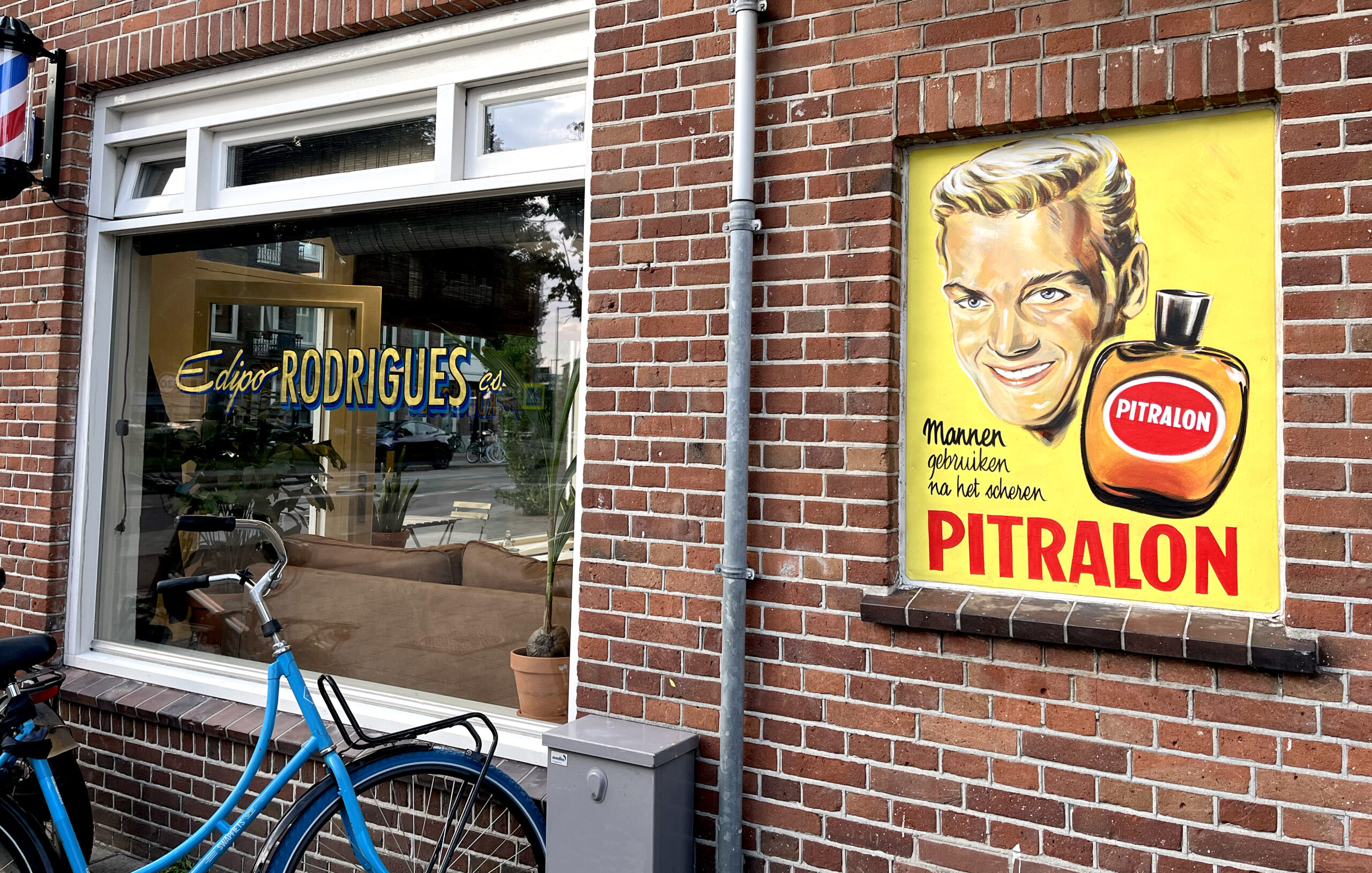Voor het raam hebben we het logo ontworpen en uitgevoerd in bladgoud in mat en glans waardoor het extra opvalt en goed leesbaar is voor voorbijgangers. Binnenin de zaak schilderden we een afbeelding van een dame met een flinke wapperende haardos, buiten was er ruimte in een nis voor een vintage schildering die we in stijl hebben gemaakt.
