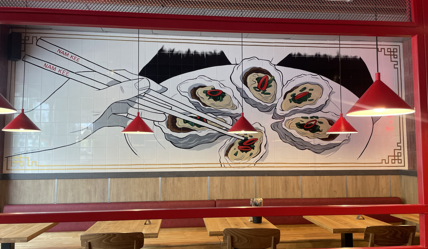 Het Chinese restaurant Nam kee is al jaren een begrip op de Amsterdamse Zeedijk en sinds de overname door de nieuwe eigenaar kunnen mensen ook terecht in een nieuw filiaal op het Gelderlandplein in Amstelveen. Samen met de eigenaar zijn we tot een ontwerp gekomen waarin de ‘Oesters van Nam Kee’ zijn afgebeeld, wat goed samengaat met het ontwerp van het nieuwe interieur.